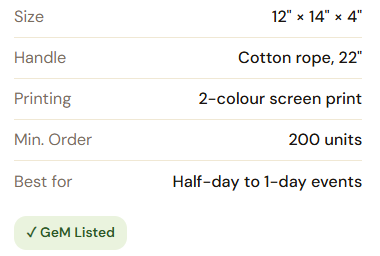 Logo printing is bundled directly into our per-unit GeM price — there is no separate process or additional PO required. Share your artwork (logo, event name, tagline) through the GeM query system at enquiry stage. We confirm the print layout in writing. The printed bags are what gets delivered under the standard GeM order. Your invoice reflects one clean per-unit price inclusive of printing.