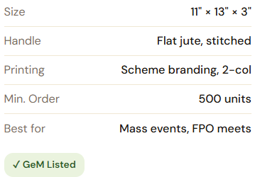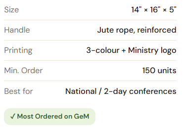 For a 2-day national conference where delegates carry documents, notebooks, water bottles, and branded material, we recommend 350 GSM. This weight holds shape, does not sag, and looks substantial in photographs — important when senior officials and media are present. For half-day or single-day events like district meets, 250–300 GSM is sufficient. For mass-scale events (Krishi Mela, SHG summits) with 1000+ attendees, 250 GSM laminated jute offers durability at scale.